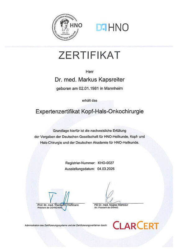 Fachärztin/ Facharzt für: Hals-Nasen-OhrenheilkundeSchwerpunktbezeichnungen: Onkologische Kopf-Hals-Tumor-Chirurgie, Rekonstruktive (mikrovaskuläre) Kopf- Hals-Chirurgie, Speicheldrüsenchirurgie
