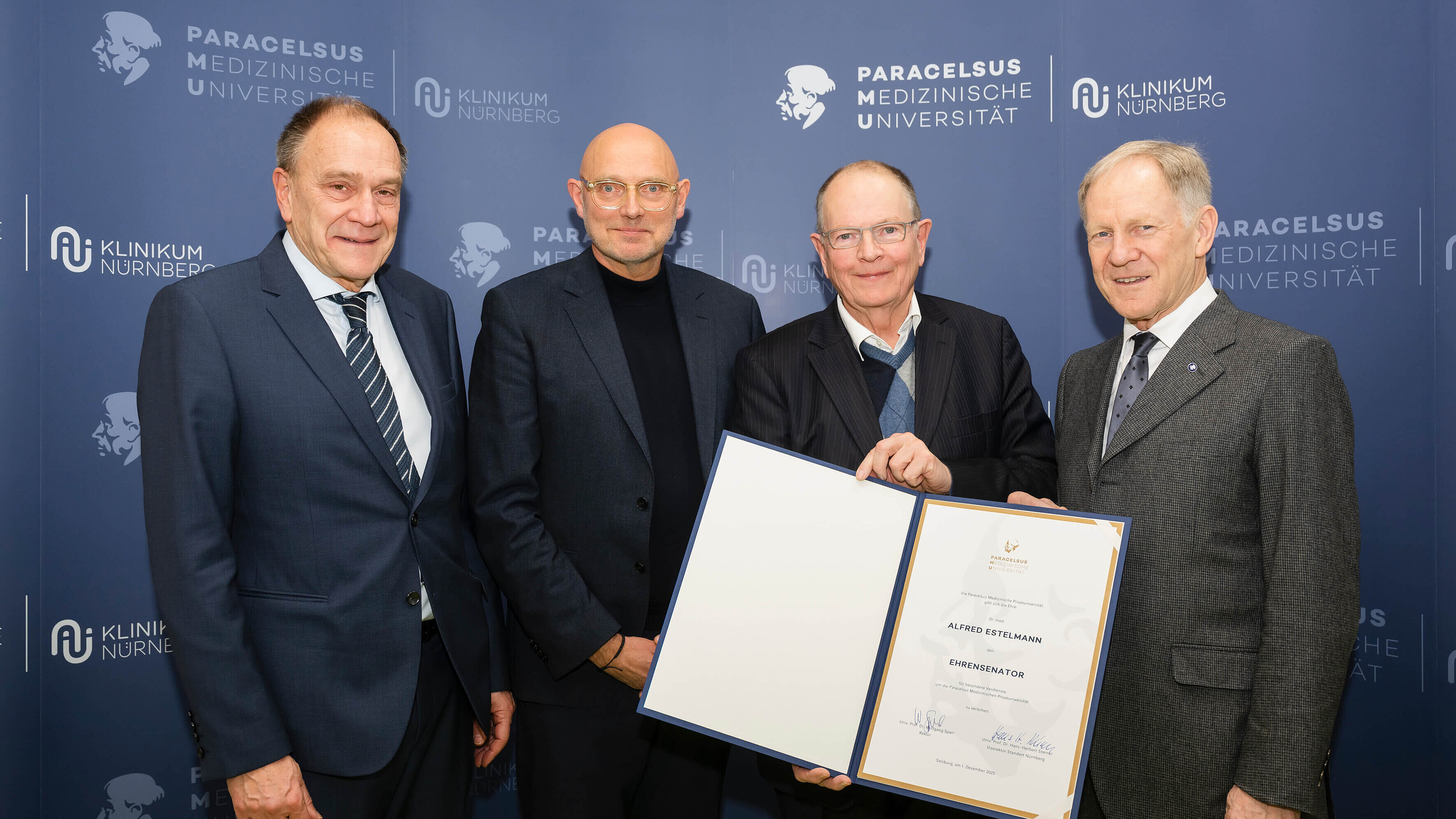 Als Ehrensenator der PMU wurde Dr. med. Alfred Estelmann, früherer Vorstand des Klinikum Nürnbergs, besonders in der Feier gewürdigt. Sperl erwähnte die unterschiedlichen professionellen Talente Estelmanns, vom Bäcker über den Diplom-Kaufmann bis zum Pädiater, die kombiniert mit seiner besonderen Hartnäckigkeit erst die Gründung der privaten Universität am Klinikum Nürnberg 2014 möglich gemacht hätten.