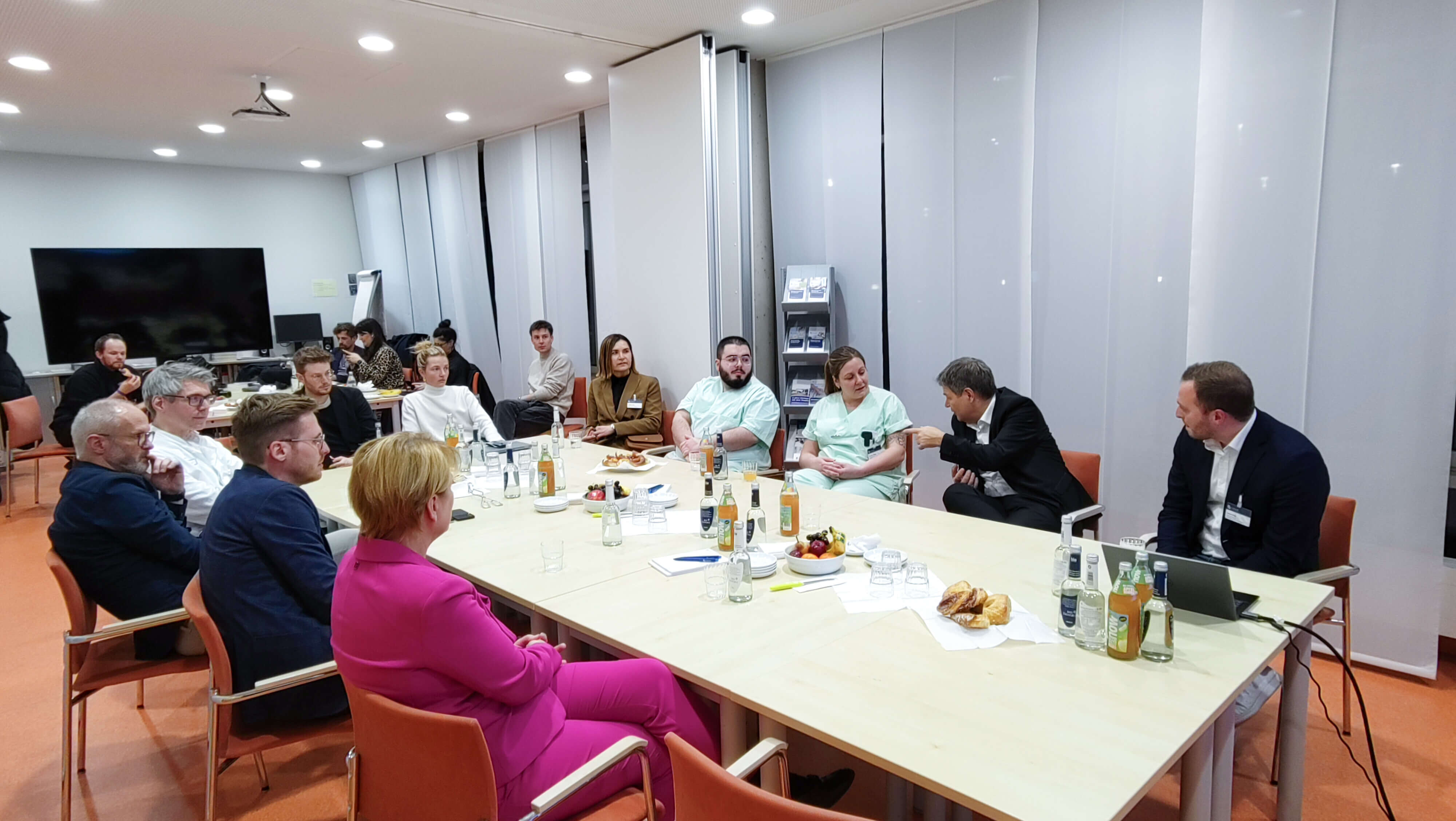 Habeck traf sich auch zum Gespräch mit Mitgliedern der Klinikumsleitung. Sabine Beßler (Vorstand Personal und Compliance), Marcel Fleig (Bereichsleiter Strategie und Kommunikation) und Tobias Ludwig (Geschäftsführender Direktor Campus Nord) erläuterten dem Grünen-Spitzenkandidaten Ursachen der strukturellen Unterfinanzierung deutscher Krankenhäuser und Beispiele, wie sich Bürokratie konkret abbauen ließe. Weiteres Thema war die 2024 verabschiedete Krankenhausreform: Das Klinikum Nürnberg befürwortet die Reform grundsätzlich, sieht aber noch dringenden Nachbesserungsbedarf in Regulierungsfragen und im Vergütungssystem.