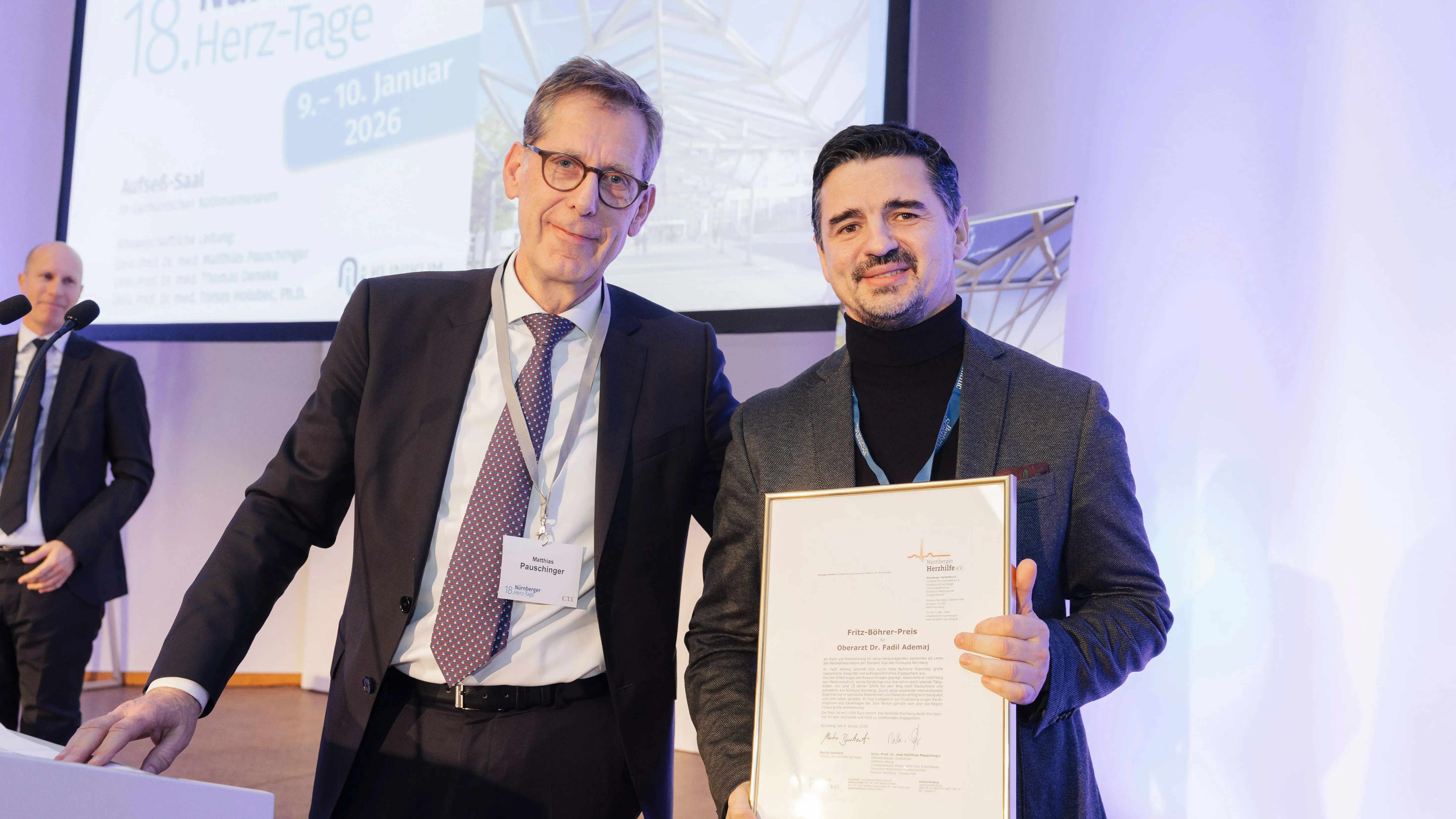 Diesjähriger Preisträger ist Oberarzt Dr. Fadil Ademaj. Er leitet das Herzkatheterlabor am Klinikum Nürnberg am Standort Süd und zeichnet sich durch exzellente fachliche Expertise, große menschliche Integrität und außergewöhnliches Engagement aus.
