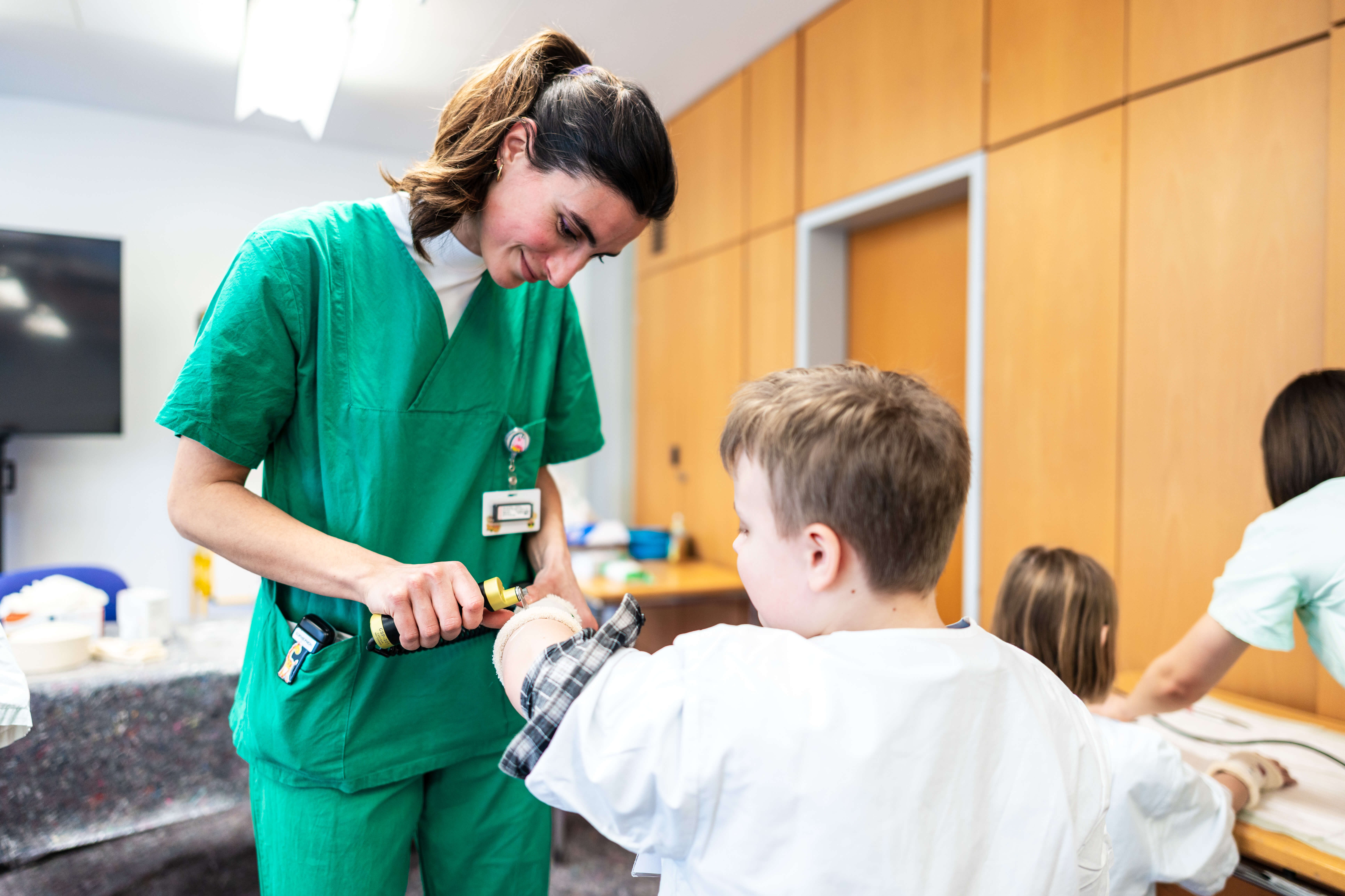 Dabei waren 40 Kinder im Alter zwischen acht und zwölf Jahren – damit war die Sommersemester-Veranstaltung wieder ausgebucht. Die Kolleginnen und Kollegen aus der Klinik für Kinder- und Jugendchirurgie und Kinderurologie sowie der Klinik für Neugeborene, Kinder und Jugendliche hatten sich ein spannendes Programm zum Thema Kindernotfälle ausgedacht.