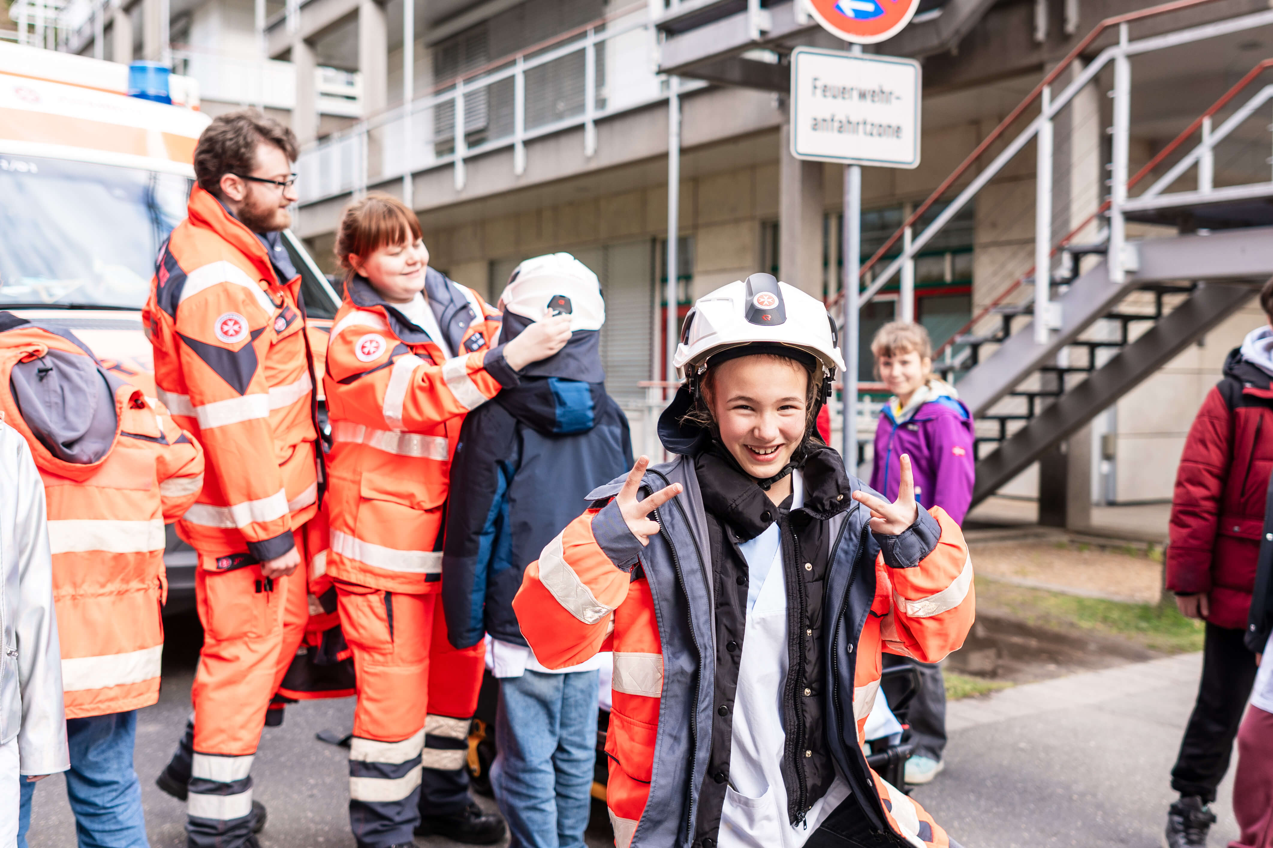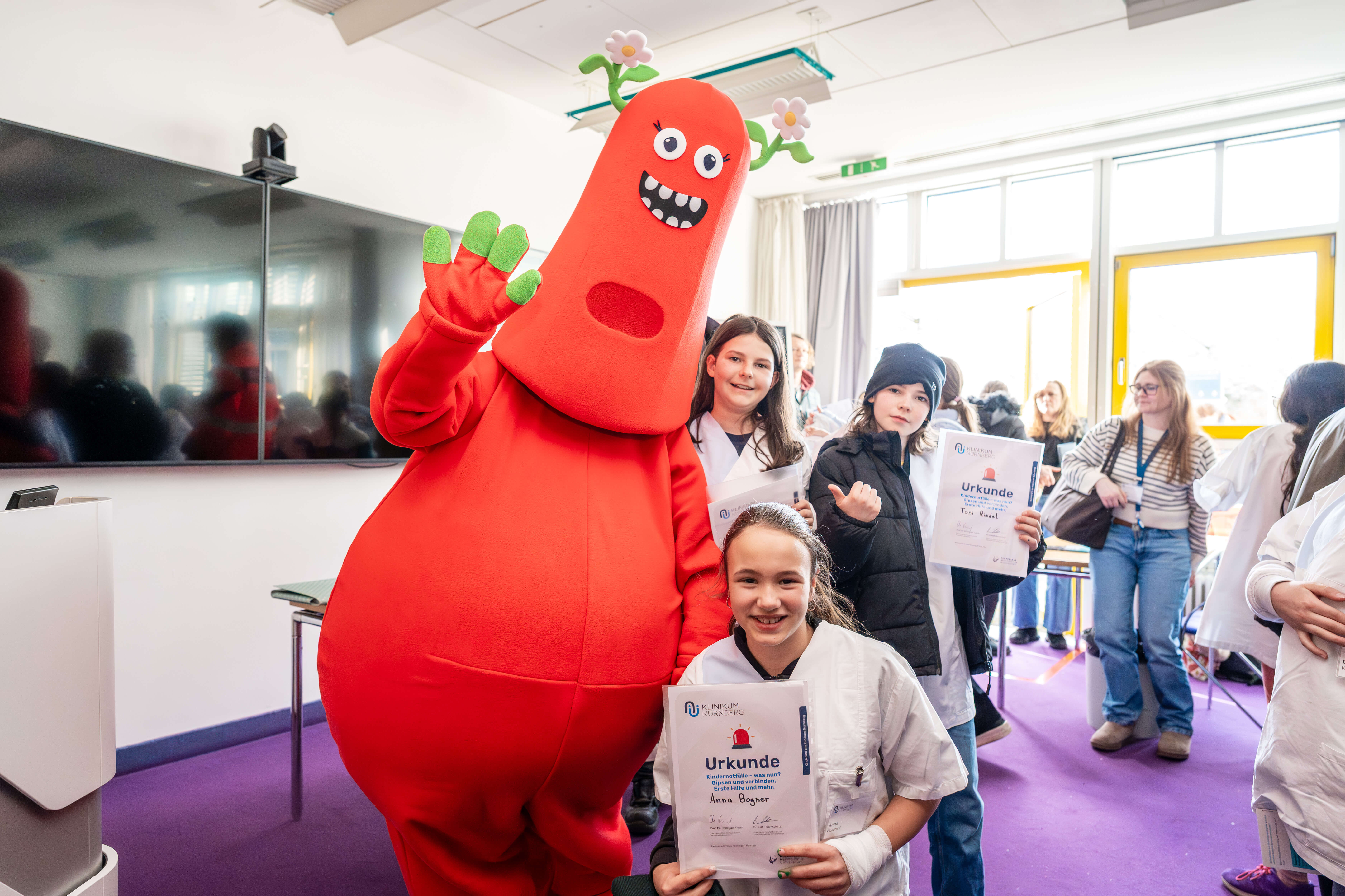 Nach einer gemeinsamen Vorlesung ging es für die Kinder an vier Stationen praktisch zur Sache. So konnten die mit Dienstkleidung ausgestatteten Nachwuchsmedizinerinnen und -mediziner mit Übungspuppen lernen, in welchem Rhythmus die Herzdruckmassage am besten klappt, welche Funktionen ein Inkubator-Bett hat und wie man einen Arm eingipst. Zudem war die Johanniter-Unfall-Hilfe vom Regionalverband Mittelfranken mit dabei und zeigte den Kindern, wie ein Rettungswagen von innen aussieht. Die Kinder konnten außerdem die Fahrtrage selbst ausprobieren. In der Pause wartete das Küchen-Team mit einem Snack zur Stärkung auf. Für die erfolgreiche Teilnahme gab es dann noch eine Urkunde und einen Aufkleber für das Studienbuch – überreicht von Überraschungsgast Frizzi, dem Maskottchen des Kinderklinikums Nürnberg, höchstpersönlich.