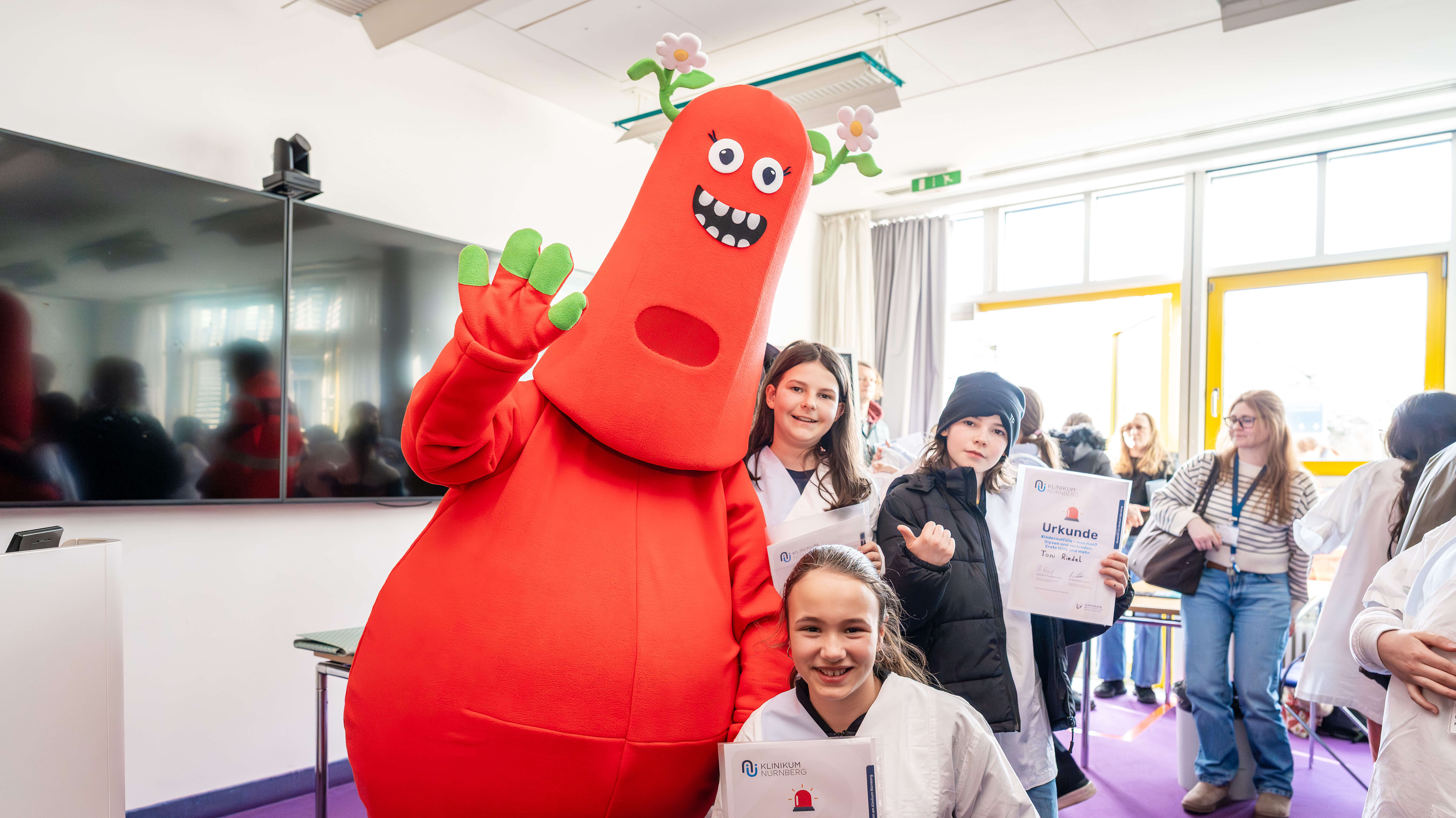 Nach einer gemeinsamen Vorlesung ging es für die Kinder an vier Stationen praktisch zur Sache. So konnten die mit Dienstkleidung ausgestatteten Nachwuchsmedizinerinnen und -mediziner mit Übungspuppen lernen, in welchem Rhythmus die Herzdruckmassage am besten klappt, welche Funktionen ein Inkubator-Bett hat und wie man einen Arm eingipst. Zudem war die Johanniter-Unfall-Hilfe vom Regionalverband Mittelfranken mit dabei und zeigte den Kindern, wie ein Rettungswagen von innen aussieht. Die Kinder konnten außerdem die Fahrtrage selbst ausprobieren. In der Pause wartete das Küchen-Team mit einem Snack zur Stärkung auf. Für die erfolgreiche Teilnahme gab es dann noch eine Urkunde und einen Aufkleber für das Studienbuch – überreicht von Überraschungsgast Frizzi, dem Maskottchen des Kinderklinikums Nürnberg, höchstpersönlich.