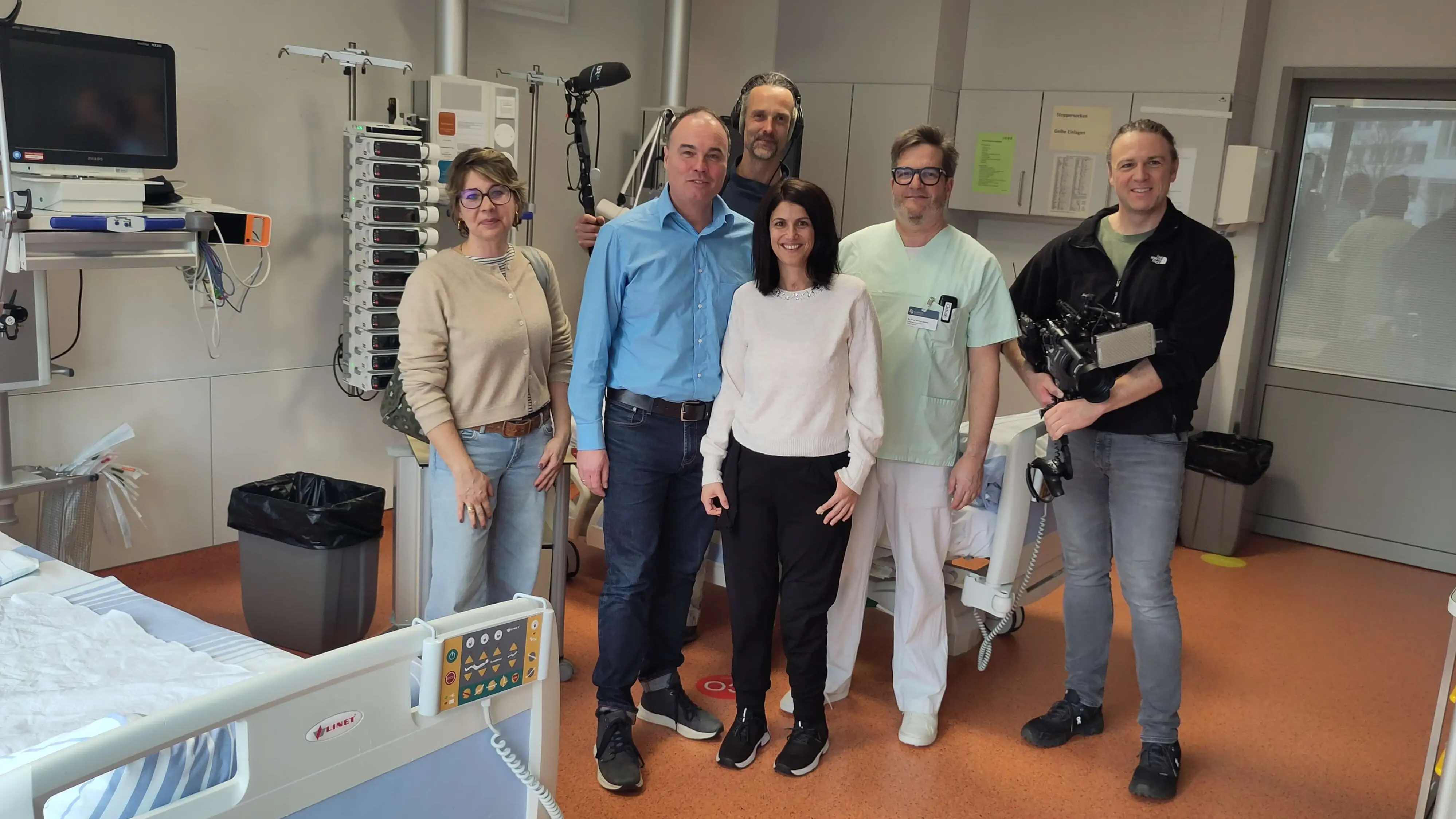 Bild: Das BR-Fernsehteam mit Torsten (2. v. l.) und Britta Eigendorf (Mitte) sowie Dr. Arnim Geise (2. v. r.) beim Treffen auf der internistischen Intensivstation im Februar 2026.