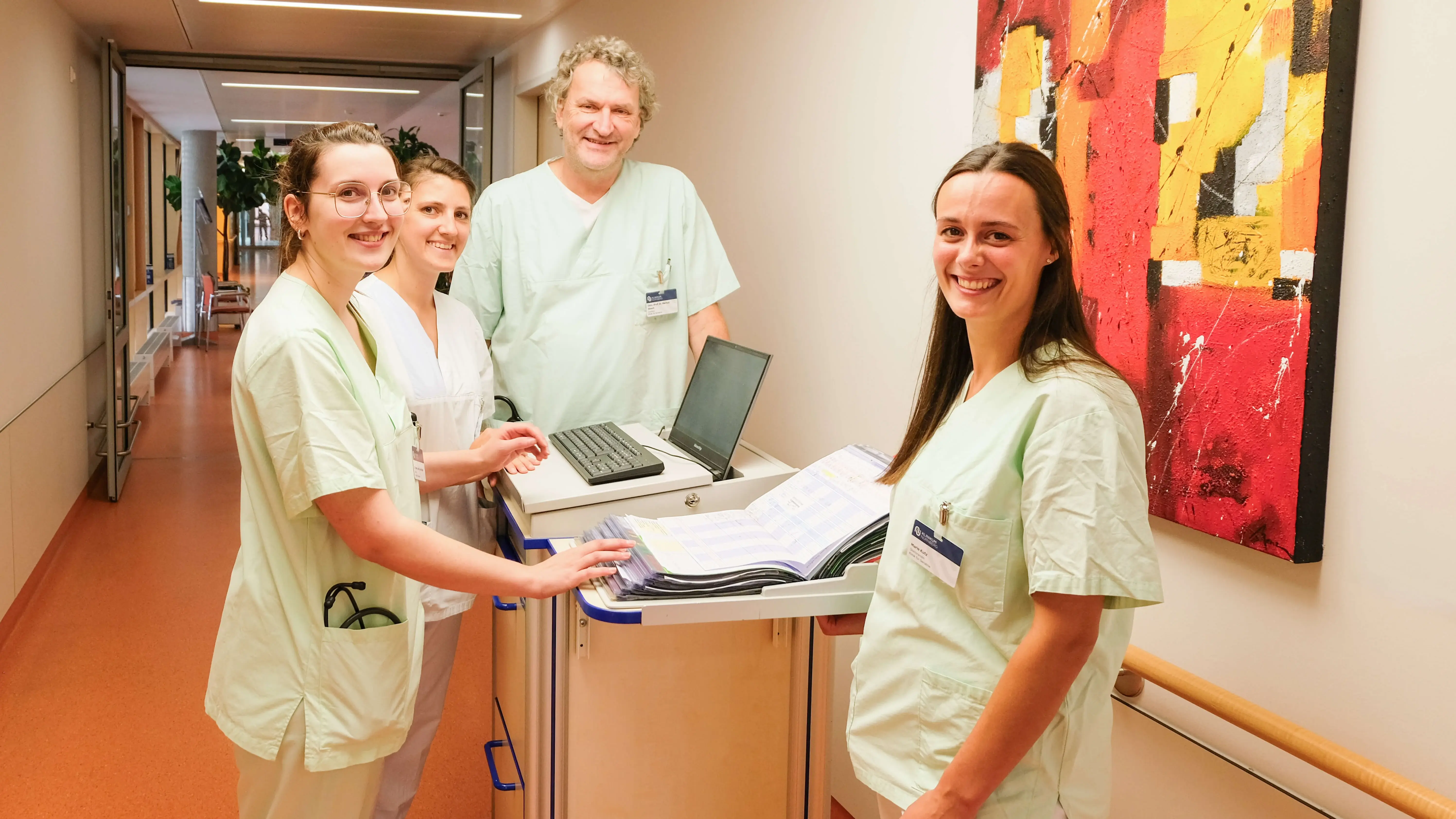 Bild oben: Apothekerin Marie Kutz (re.) stellt für ihre Dissertation über ein Jahr Arzneimittelverordnungen und Patientenkurven in der Geriatrie des Klinikums Nürnberg auf den Prüfstand – hier mit Chefarzt Univ.-Prof. Dr. Markus Gosch und Stationsmitarbeiterinnen.