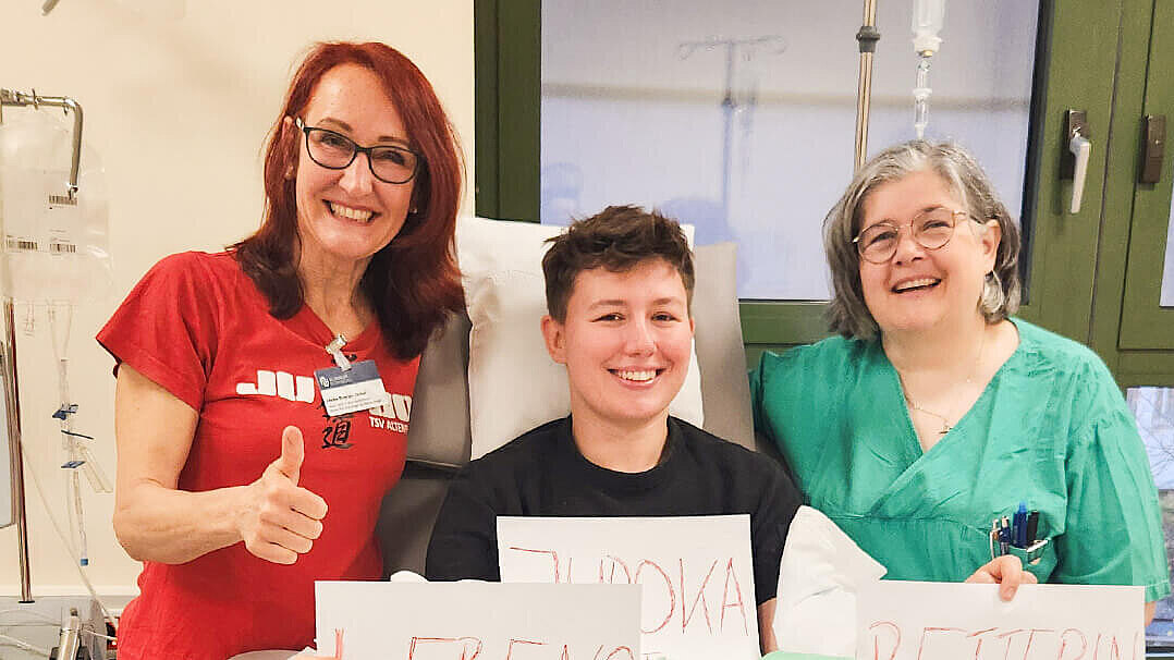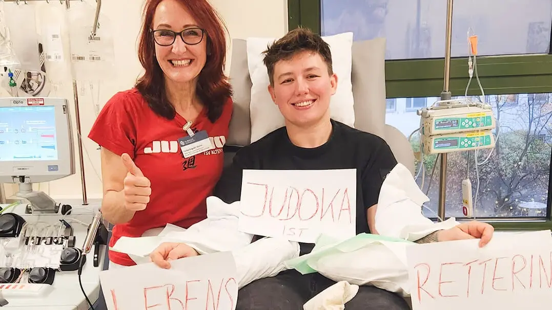 Herzliche Begegnung unter Sportlerinnen in der Knochenmarktransplantations-Ambulanz des Klinikums Nürnberg: Die frühere Judo-Athletin Lisa Dollinger spendete hier Stammzellen in Zusammenarbeit mit der DKMS – betreut von Spendenkoordinatorin Heike Bogner-Distel, die selbst leidenschaftliche Judoka und Judo-Kindertrainerin ist.